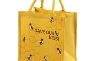 Yellow with bee pattern and Save Our Bees slogan. with padded handles.