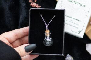 Give the gift of crystal magic with this miniature potion bottle necklace. With natural black obsidian chips and a cork stopper, this necklace serves as a spellbinding accessory while repelling negative energies and promoting stability. Presented in a matching gift box and perfect for that special witch in your life. Plastic bottle on a nickel-free stainless steel chain.