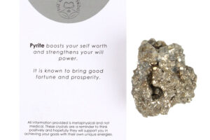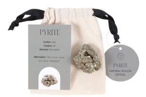 Pyrite (also known as fool’s gold) stones are said to promote spiritual wealth and are commonly used as an aid in crystal healing. Harness its rumoured healing properties to overcome fears and attract positive energies. Comes in a cotton drawstring pouch with matching information card. Size, shape and colour of stone will vary due to its unique nature.