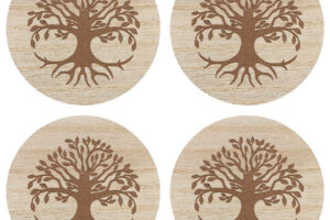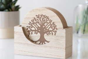A set of 4 wooden coasters in a matching holder featuring an engraved Tree of Life silhouette.